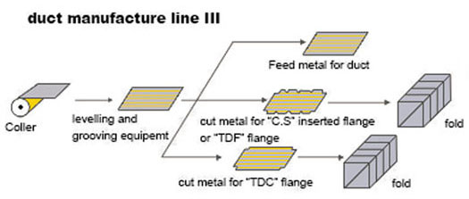 生產Ⅲ線是由上料架、調平壓筋機、沖尖口和沖方口油壓機、液壓剪板機、液壓折邊機所組成。電器控制部分采用全電腦控制,該控制系統(tǒng)具有閉環(huán)反饋系統(tǒng),生產精度和穩(wěn)定性明顯升高。其大工作速度為10米/分。長度誤差為±0.5mm,對角線誤差 ±0.8mm。 本系統(tǒng)可單班生產1000M2方型風管能力。